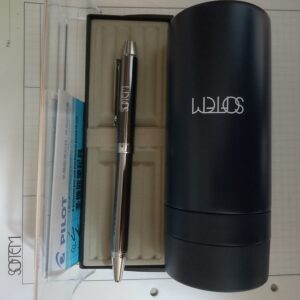 みんなに配られたソフテムコムボールペン、ソフテムコム名刺入れ、ソフテムコム水筒、